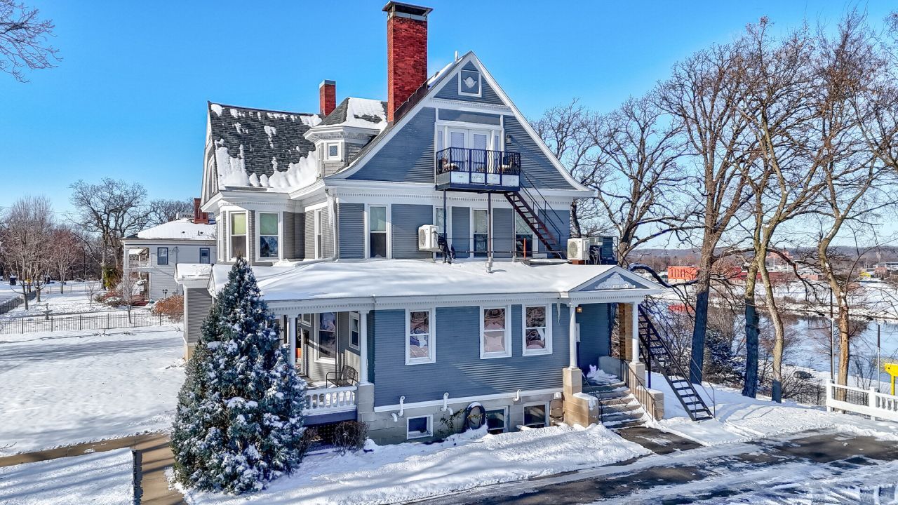 Welcome to the Cora J. Pope Home, one of Ottawa's most recognizable historic landmarks and a rare opportunity for anyone seeking a luxury Airbnb, boutique inn, or bed-and-breakfast property. Built in 1902 by Milton and Cora Pickens Pope, this Victorian masterpiece has been lovingly restored to its original grandeur while thoughtfully updated for modern comfort. Perched on a scenic bluff overlooking downtown Ottawa and the Illinois River, the home immediately impresses with its stately exterior, welcoming porch, decks and balconies, and intricate architectural details that have welcomed guests for more than a century. Inside, the grand foyer sets the tone with elegant woodwork and a hearth room featuring a fireplace, a stunning staircase, and warm gathering space. The adjacent full bathroom with a garden tub sits conveniently beneath the stairs. Off the hearth room you'll find a large formal parlor with space to relax, entertain, or simply enjoy the ambiance of a home with deep local roots; an elevator provides additional convenience. The family room offers another cozy retreat with a second fireplace, built-ins, and a turret-style sitting nook perfectly positioned for river views. The formal dining room is a showstopper with beamed ceilings, wainscoting, built-in china cabinet, and a fireplace, creating a timeless atmosphere for gatherings of any size. A kitchenette or butler's pantry with original cabinetry and leathered granite connects to the main kitchen, which blends modern stainless steel appliances with custom cabinetry designed to match the home's historic character. The main level also includes a bedroom currently used as an office, a full bathroom, and three additional flex rooms currently used as a gathering room, family room, and gift shop, offering excellent layout options for guest suites or business use. Upstairs, the expansive landing showcases leaded glass windows with sweeping river views and leads to four bedrooms, each full of character. Cora's room features birds-eye maple woodwork, a fireplace, and an en-suite bathroom with a stunning soaking tub and separate water closet. Milton's room also includes an en-suite bathroom and connects to an adjoining bedroom that can remain private or linked as a suite. The Starved Rock room sits next to a historic full bathroom with original wet-set subway tile and soaking tub. An additional full bathroom with tub/shower rounds out the second level. The third floor continues the home's rich character with the Riverview Suite, named for its stunning views, complete with French doors opening to a private balcony and an en-suite full bathroom. The Bishop's Suite features beautiful exposed brick, a walk-in closet, an impressive bath with curved walls showcasing a soaking tub, and an attached secondary bedroom and kitchenette, making it ideal for extended-stay guests. The basement houses exceptionally well-maintained mechanical systems, including a fire-suppression system with three 100-gallon