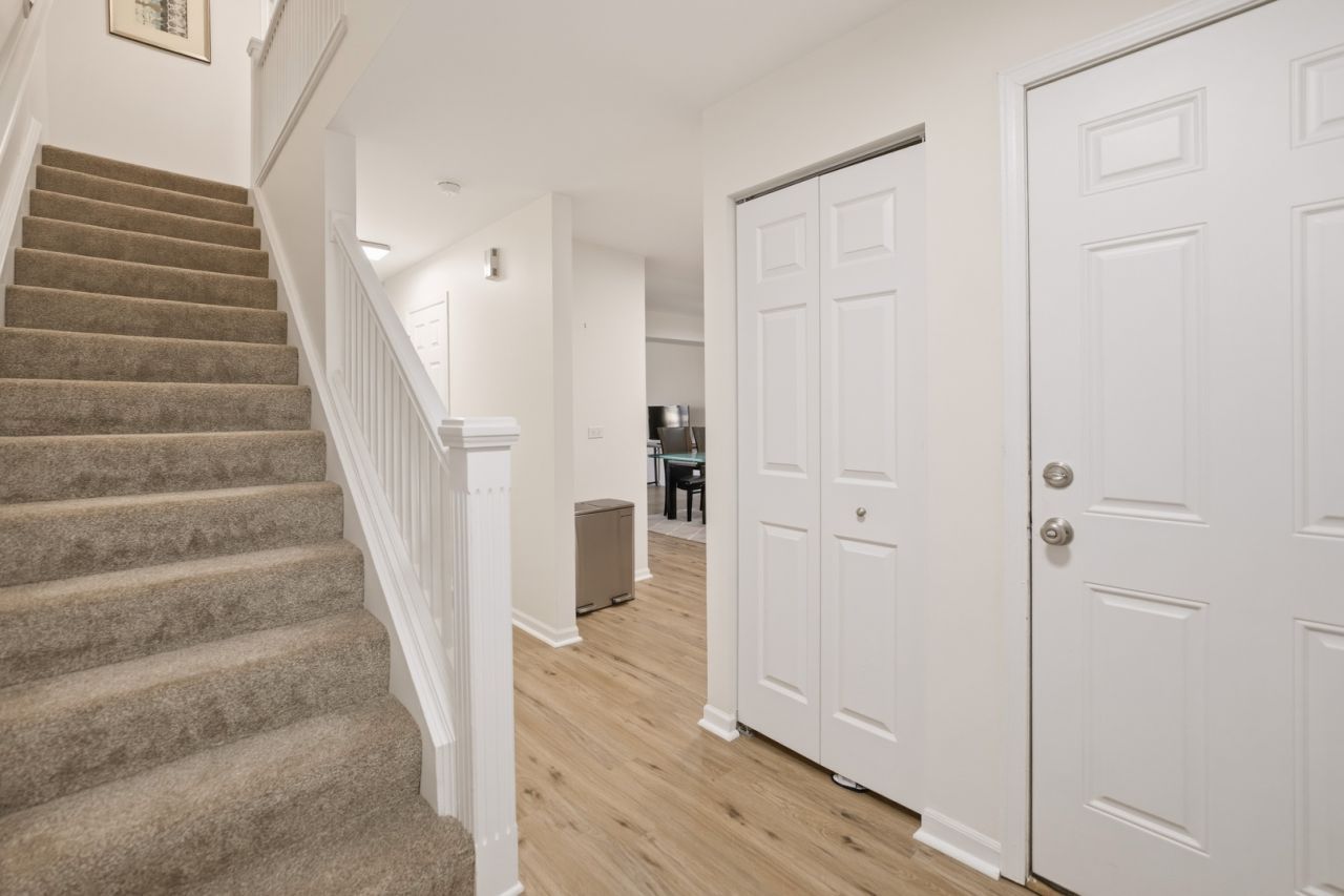 Picture-perfect and fully updated, this stunning 2-story townhome offers the ideal blend of style, comfort, and functionality. Featuring a spacious open-concept, designed for effortless everyday living and entertainment. Main level showcases NEW laminate wood flooring throughout, NEW fresh paint, an oversized combined living and dining space elevated by a cozy gas-starting, wood burning fire place. The kitchen highlights quartz countertops, an island peninsula perfect for additional prepping and seating, custom subway backsplash tile, stainless steel appliances 2024, exceptional cabinet storage space, and a pantry closet! 2nd floor stuns with NEW carpet, a spacious primary suite, grand ceiling lines gleaming with natural sunlight, and a full master bath! All bedrooms are generously sized with efficient closet storage space. Bathrooms feature sky lights, custom vanities with quartz countertops, upgraded plumbing fixtures, designer lighting, and modern hardware. All this plus a finished basement adding a family room and a flexible area perfect for a gym or office set up. This home is completed with a two-car garage and a two-car driveway, NEW over sized deck, furnace 2024, AC 2024, hot water heater 2023 and washer/dryer 2024. Prime location close to shopping, dining, restaurants, and easy expressway access! Schedule your showing today!