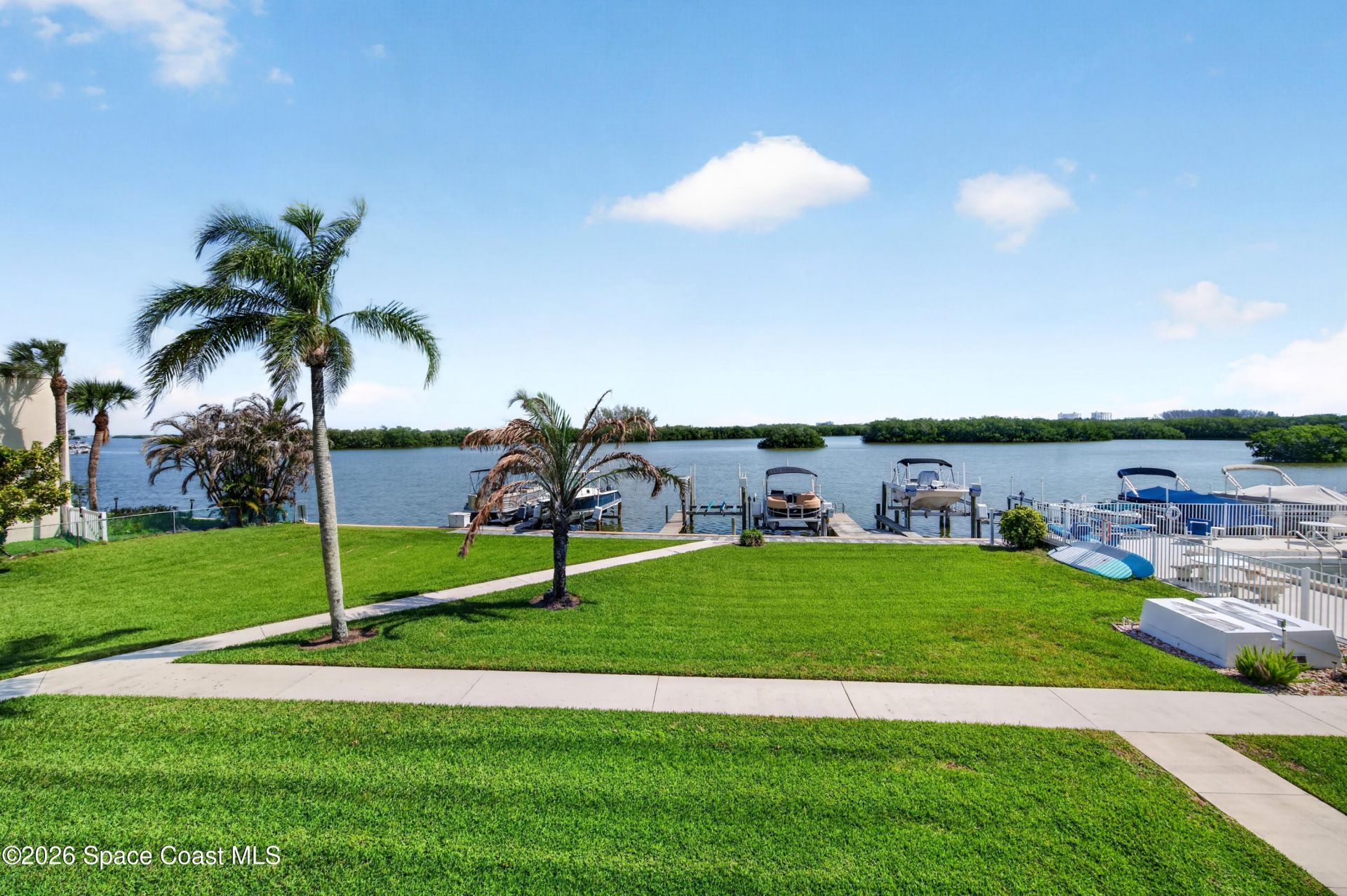 Welcome to the picturesque, and just 16 unit riverfront complex of River Club Condo in beautiful Cocoa Beach, FL. Your backyard will consist of amazing views of the Banana River and Cocoa Beachs Thousand Islands. From your 2nd floor balcony, you will enjoy the sunrise, sunset, see the manatees and dolphins play, and watch rocket launches! The Bright open floor plan, offers great entertaining space, as wel as generous sized bedrooms and closet space. Recent upgrades include New flooring, New HVAC, New Refrigerator & Microwave, New recessed lighting and fans, and New Textured Ceilings and Closets. The guest bedrooms boast plantation shutters and nice closet space. A built in Tiki Bar on the private balcony adds a great coastal feel to the space. You will love boating and fishing with ease just steps from your unit in a deeded slip ready for a boat lift, enjoy coastal lifestyle. Just a short bike ride to the beach on sidewalks, 18 hole golf course, tennis and pickleball courts. The condo is close to Downtown Cocoa Beach, Golf Course, Tennis, Aquatic Center, Patrick Space Force based, Port Canaveral, KSC, and so much more! Comes with an assigned, covered parking space. The building has a newer roof, and pool is being resurfaced, and should be ready in a few weeks.