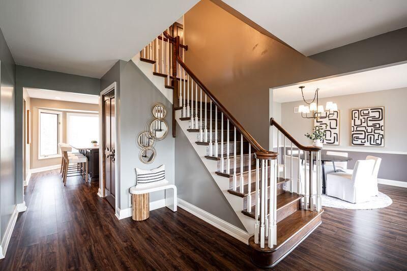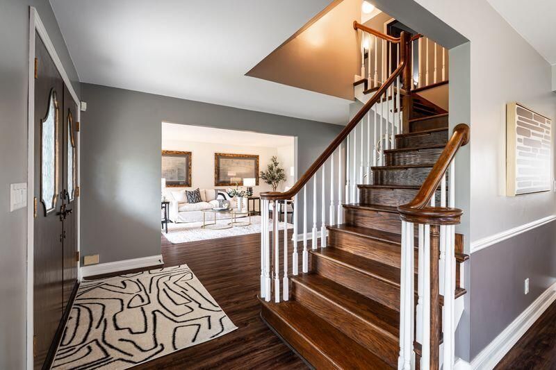 Located in sought-after River's Edge, this spacious 5-bedroom home offers the perfect blend of function and style. A main-level 5th bedroom--currently used as a home office--sits adjacent to a full bath, ideal for guests or flex living.The updated kitchen features an oversized refrigerator, large island, abundant storage, and beautiful views of the backyard. Generous living and dining rooms provide the perfect setting for everyday living and special gatherings.Stunning family room showcases a dramatic vaulted ceiling and striking stone fireplace. Enjoy year-round sunshine in the inviting sunroom. Upstairs the primary suite offers a private retreat, along with three additional bedrooms and a full bath. The lower level includes a spacious rec room and bonus space--perfect for the hobbies!