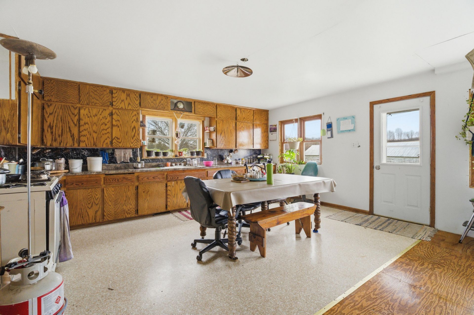Set on over 16 picturesque acres, this spacious farmhouse is packed w/ potential & ready for your vision. Featuring the possibility of up to 6 bdrms, this home offers plenty of space to grow, renovate & make your own. Main level includes a spacious eat-in kitchen w/ a walk-in pantry, large living room & primary bedroom plus a full bath. 3+ additional bedrms w/ plumbing already in place for a second bath upstairs--making future expansion even easier. Attached 3+ car attached garage, perfect for vehicles, storage, or a workshop. The property included numerous outbuildings which include a large barn, a huge workshop and several smaller buildings for animals or storage. The property itself offers endless opportunities for hobby farming, recreation, or simply enjoying peaceful country living.