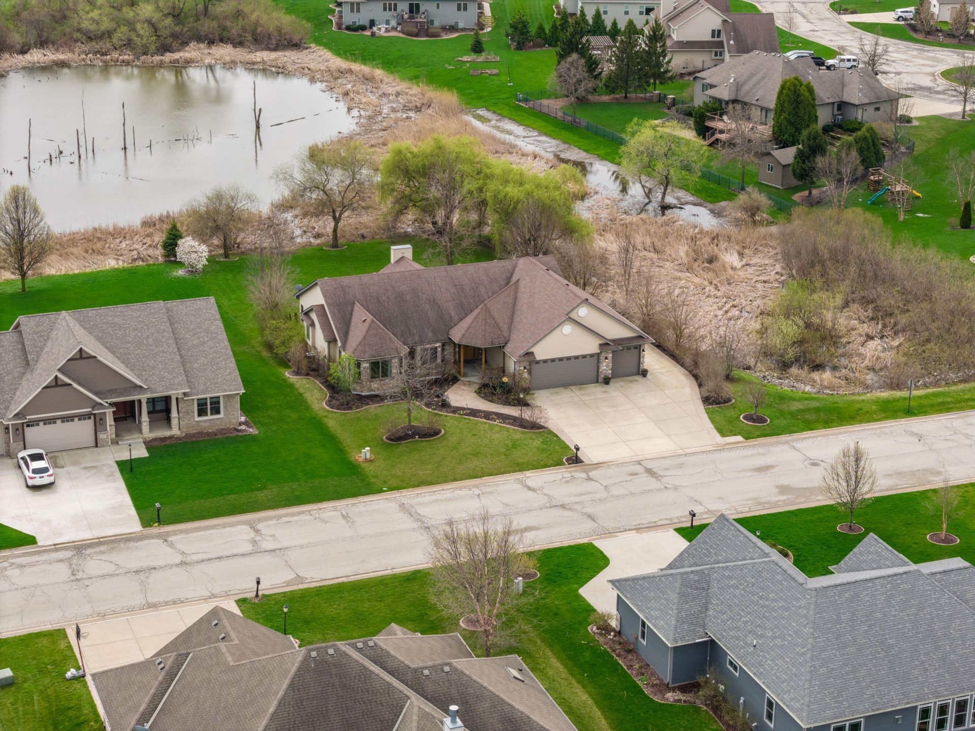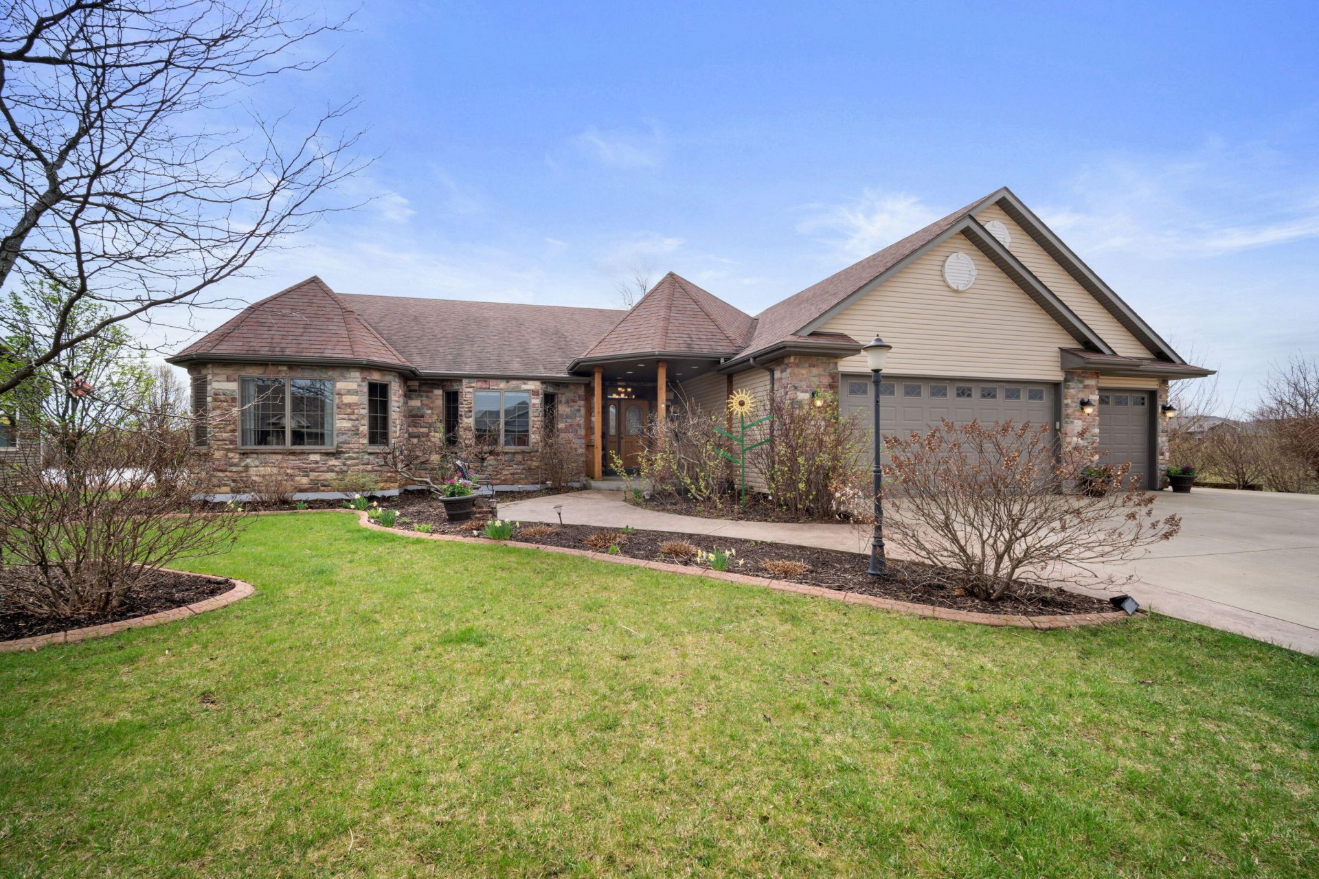 Custom-built ranch in Jamestown with 100' of pond frontage and no neighbor to the east--talk about privacy! A beautiful foyer opens to the living room featuring a fireplace and oversized windows. Open kitchen with stainless steel appliances, breakfast bar and great flow for entertaining. Sunroom with walk out access to the expansive deck and patio overlooking the pond. Primary suite with whirlpool tub, separate shower, skylight and spacious walk-in closet. Partially finished lower level for entertaining, featuring a custom bar area, half bath, 9' ceilings, full size windows, and versatile bonus rooms ideal for a home office, gym, or guest space. 900sqft garage with 4th car potential, expansive walk-up attic, dual laundry rooms, plus a huge parking pad for camper, boat, or extra vehicles!