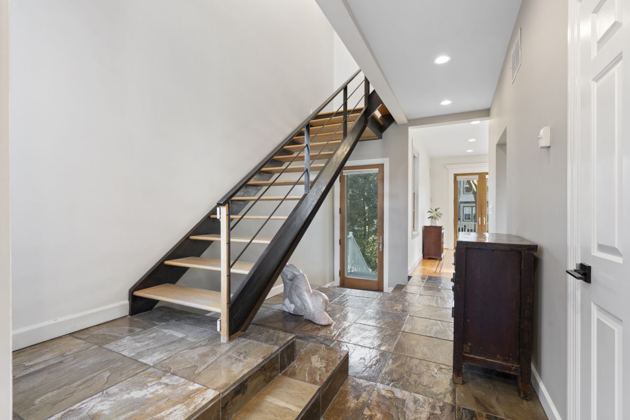 Tremendous home situated on a 32-foot-wide lot with remarkable curb appeal and an inviting front porch. This well-appointed 4-bedroom, 3.1-bath residence offers unparalleled natural light from the south and west exposures. A functional layout, quality updates, and meticulous maintenance make this home truly turnkey. A unique side entrance leads into a dramatic two-story atrium featuring an open staircase and skylights. The oversized, updated white kitchen is equipped with professional-grade appliances, a spacious island, and breakfast bar, and opens to an extra-wide great room with three walls of windows. A separate formal dining room with fireplace provides exceptional entertaining space, enhanced by large French doors that open to the covered front porch. The second level includes three well-appointed bedrooms, two full baths, and convenient laundry. The spacious primary suite features vaulted ceilings, skylights, and an updated, oversized bathroom with double vanity, separate shower and tub, and a large walk-in closet. The lower level offers a generous family room with radiant heated floors, fireplace, and wet bar, along with an additional bedroom and full bath-ideal for guests. Outdoor living is equally impressive with a newer synthetic deck and patio, perfect for entertaining. Complete with a three-car garage.