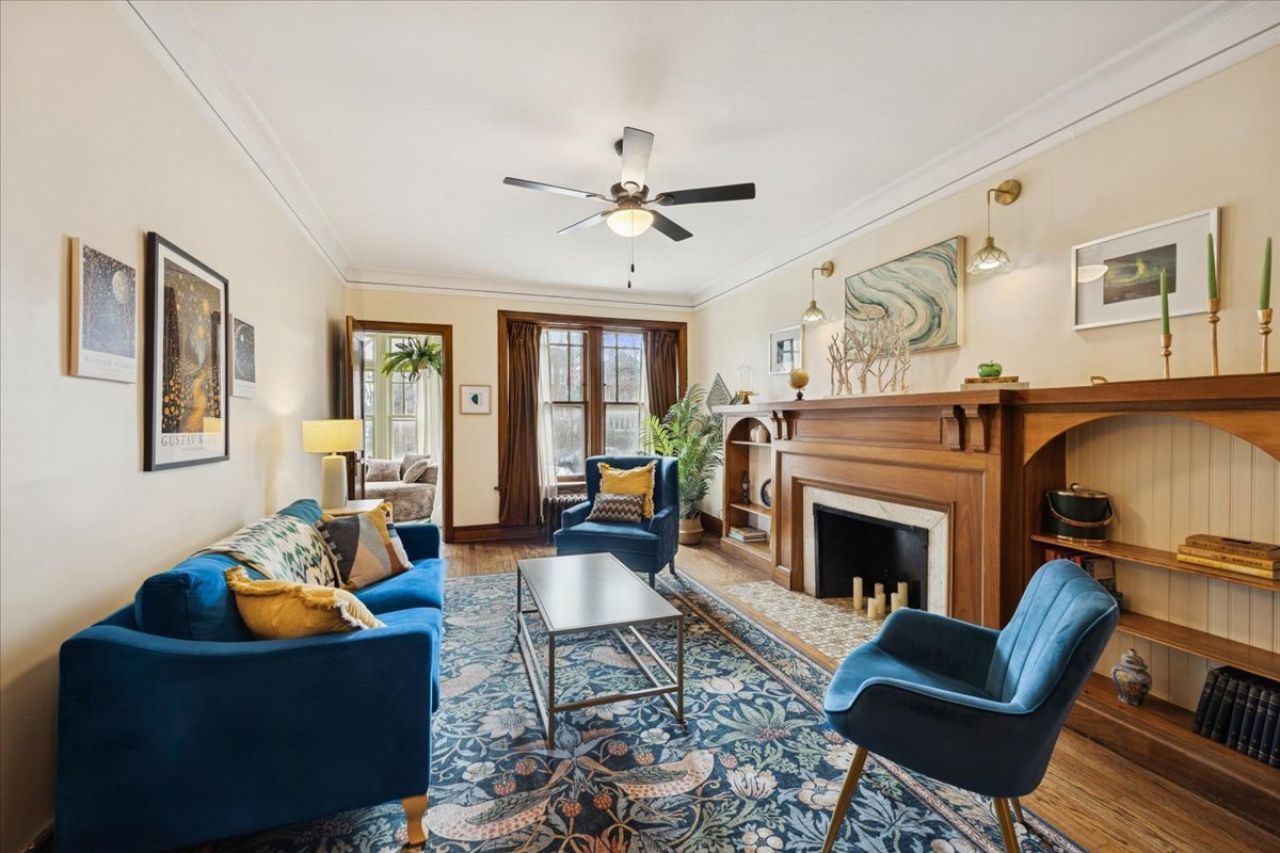 Beautifully refreshed vintage condo that lives like a single-family home. This oversized 3-bedroom, 2 full-bath corner unit offers generous room sizes, an inviting entry, and a flexible layout with a separate dining room (with a Juliette balcony) currently used as a family room. The home has been freshly painted, and three of the rooms feature stunning, drench-painted walls for a bold, designer look - the primary bedroom, sunroom, and dining room. Vintage details shine throughout, including refinished hardwood floors, original millwork and molding, solid wood doors, and a decorative fireplace framed by arched built-in bookcases. The sunroom with windows on three sides, bringing in beautiful natural light and working perfectly as a lounge, reading area, or home office. You'll also appreciate the ease of a step-up first-floor location and in-unit laundry. Closet space is generous, and there's an extra-large private storage room in the basement for everything you don't want in your daily rotation. Out back, enjoy a private porch overlooking a professionally landscaped courtyard. Cats and dogs are welcome, and 24-hour permit street parking makes day-to-day life simple. Ideally located at 38 Washington Blvd in Oak Park, close to dining, shopping, parks, and transit. Light-filled, spacious, and move-in ready - this one you've been waiting for.