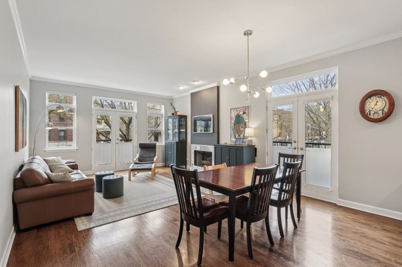 Move-in ready Buena Park duplex featuring a renovated kitchen, updated baths, and flexible living spaces throughout. A bright, spacious living room showcases hardwood floors, a gas fireplace, and tranquil tree-lined views. The dining area offers a second Juliet balcony and flows seamlessly into the eat-in kitchen, complete with a large peninsula with seating for four or more, a farmhouse stainless steel sink, abundant white cabinetry with modern hardware, and a classic subway tile backsplash. The primary suite provides sliding door access to a generous covered deck, ample space for a king-sized bed and additional furnishings, and an en-suite bath with dual vanities and a glass-enclosed shower with floor-to-ceiling tile. Additional bathrooms are well-appointed with full subway tile walls, flooring, and storage vanities. The lower-level family room is huge and stylish, ideal for a variety of uses. Office, play space, home theater and more. Thoughtfully updated throughout including new lower level windows. This home also includes one assigned gated parking space. Prime Buena Park location with convenient access to the Lake, the Lake Shore Drive express bus, Red Line, Target, Wrigley Field, Wrigleyville, newly approved Trader Joe's, Jewel, Aldi, parks, library and neighborhood dining/night life.