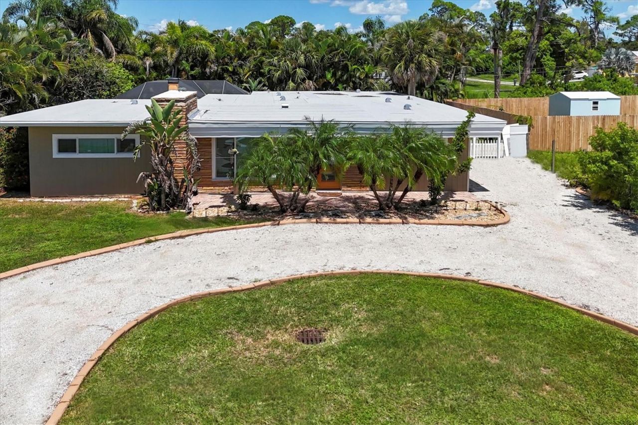 Mid-Century modern coastal retreat in South Venice, welcome to 4919 Lemon Bay Drive. Conveniently across from the Intracoastal Waterway and short distance to the private South Venice Beach ferry, this four-bedroom, two-bath home offers an ideal coastal lifestyle. The community's boat ramp and kayak launch are just a short distance away, with optional South Venice Community Association membership providing access to both amenities for approximately $200 annually. A circular crushed-shell driveway with curbing welcomes you home, offering room to park your boat or RV, along with a tropical entryway. Inside, tile flooring flows throughout, complementing the stone fireplace in the living room. The kitchen features stainless steel appliances, a breakfast bar and tile countertops. Newer sliding and French doors fill the home with natural light, while the split-bedroom layout ensures privacy. The primary suite opens to a private seating area, creating a personal retreat. Outdoor living includes several seating areas, an oversized screened lanai finished with pavers, and landscaped grounds. Updates include an updated guest bath, newer septic, and two-zone air-conditioner installed in 2024. Enjoy nearby Shamrock Park with tennis, playground, and nature trails, or bike the Venetian Waterway to Sarasota via the Legacy Trail. With no special deed restrictions, pet-friendly policies and excellent rental potential, this South Venice home combines location, lifestyle and flexibility. Excellent rental opportunity and one of the largest homes in South Venice in this price range. No HOA.
