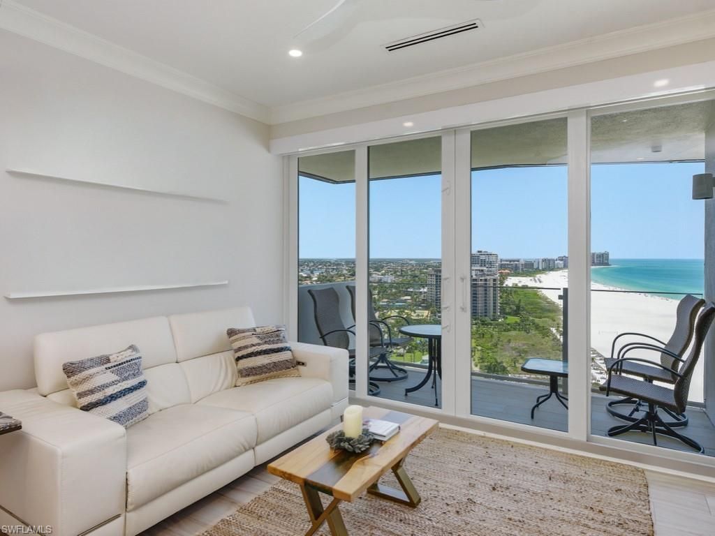 Sweeping views of Marcos crescent shaped beach abound from this highly desirable, south facing penthouse residence at Gulfview. This magnificent residence was completely renovated with the most luxurious finishes throughout. Enjoy 9 ceilings, solid 8 doors, wood-look tile flooring throughout, and so much more. The living room offers exceptional views, stacked stone feature wall, and custom shelving and cabinetry. The beautiful kitchen has been opened to the living room and features custom cabinetry, quartz counters, Thermador paneled appliances, wine cooler, and breakfast bar. The master suite is a private oasis with exceptional views of the beach, custom walk-in closet, and ensuite bath with dual vanities and walk-in shower. The guest bedroom and bath provide ample space for friends and family. The balcony is the perfect place to relax and unwind while enjoying the gentle island breeze while taking in the picturesque views of Residents Beach and the sparkling blue waters of the Gulf. Impact windows and sliders provide extra peace of mind. Gulfview offers many fine amenities - large heated pool, pickleball and tennis courts, bocce ball, exercise room, and much more. Do not hesitate to make this rarely available penthouse residence your piece of island paradise.