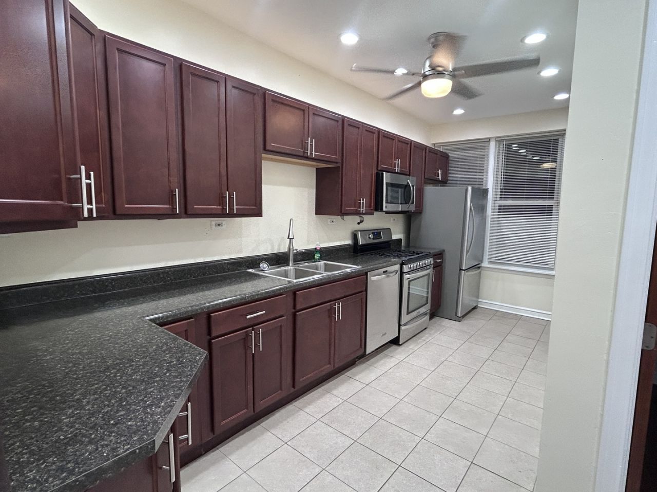 Welcome to your new home at 720 N Throop #3F! Available now, this oversized top-floor unit is in a quiet building, offering both comfort and convenience. Inside, you'll find a large, updated kitchen with plenty of space to cook, dine, and entertain. The home is freshly painted throughout, complete with recessed lighting and fans for a modern touch. The bedroom easily fits a queen-size bed, ensuring plenty of room to stretch out. Stay comfortable year-round with central heat & AC, and take advantage of on-site laundry. Just outside is your private deck that faces the courtyard. A secure gated back entry makes package delivery worry-free. Don't miss the chance to live in this prime West Town location three blocks from the Chicago Blue Line & practically across the street from Eckhart Park. No pets, please.
