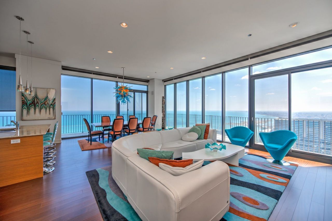 Penthouse Level-Outdoor Space: Experience breathtaking views of the lake and city from an 80th-floor penthouse in Chicago's iconic Aqua Tower. Designed by award-winning architect Jeanne Gang, the building features distinctive, gently rippling balconies that give the skyscraper its signature sculptural form. This deluxe penthouse in Chicago's Lakeshore East - New Eastside rises to the 80th floor, offering breathtaking, unobstructed views from a wrap-around balcony accessible from every room. Thoughtfully designed through the combination of two units, it showcases stunning South and East exposures. Floor-to-ceiling windows paired with 11-foot ceilings create a mesmerizing sense of space throughout this 3,500-square-foot residence, enhanced by 133 linear feet of balcony overlooking the city of Chicago and Lake Michigan in an ideal SE corner, almost 1/4 of the entire top floor. Interior: Sliding glass and screened doors lead from every room to the balcony. The home offers graciously sized rooms, including four bedrooms and three baths. Two bedrooms have been skillfully retrofitted-one into a fully equipped in-unit gym featuring a dry sauna, and the other into an office/library. The kitchen is appointed with custom cabinetry, premium granite, and top-tier appliances from Wolf, Sub-Zero, and Miele. The Primary Bedroom Suite includes an oversized Jacuzzi spa tub, separate walk-in shower, private lavatory, and an expansive, custom room-sized closet. A private ensuite guest wing features its own entrance, accessible both from inside and outside the unit. Additional highlights include an oversized laundry room with a side-by-side washer and dryer, electronic mesh shades with programmable settings, block-out blinds in the primary suite, and multiple oversized, well-organized walk-in closets throughout. Garage-Amenities: The residence includes a single oversized to double-width garage space, comfortably accommodating two cars side-by-side, located nearest the elevator. Additional deeded garage spots are available for purchase. Residents enjoy full access to building amenities: a state-of-the-art fitness center, indoor and outdoor pools, a basketball court, a one-fourth-mile running track, and a sundeck with cabanas. The building is also connected to the Pedway, offering convenient access to nearby attractions. Ideally situated just steps from Millennium Park, Michigan Avenue, and the lakefront, it places the best of Chicago right at your doorstep. Experience: Upon entering, this penthouse speaks Royal. A rare find in any major city, this is an ideal full-time home or a home away from home. A must-see to appreciate fully. Available furnished or unfurnished for immediate possession.